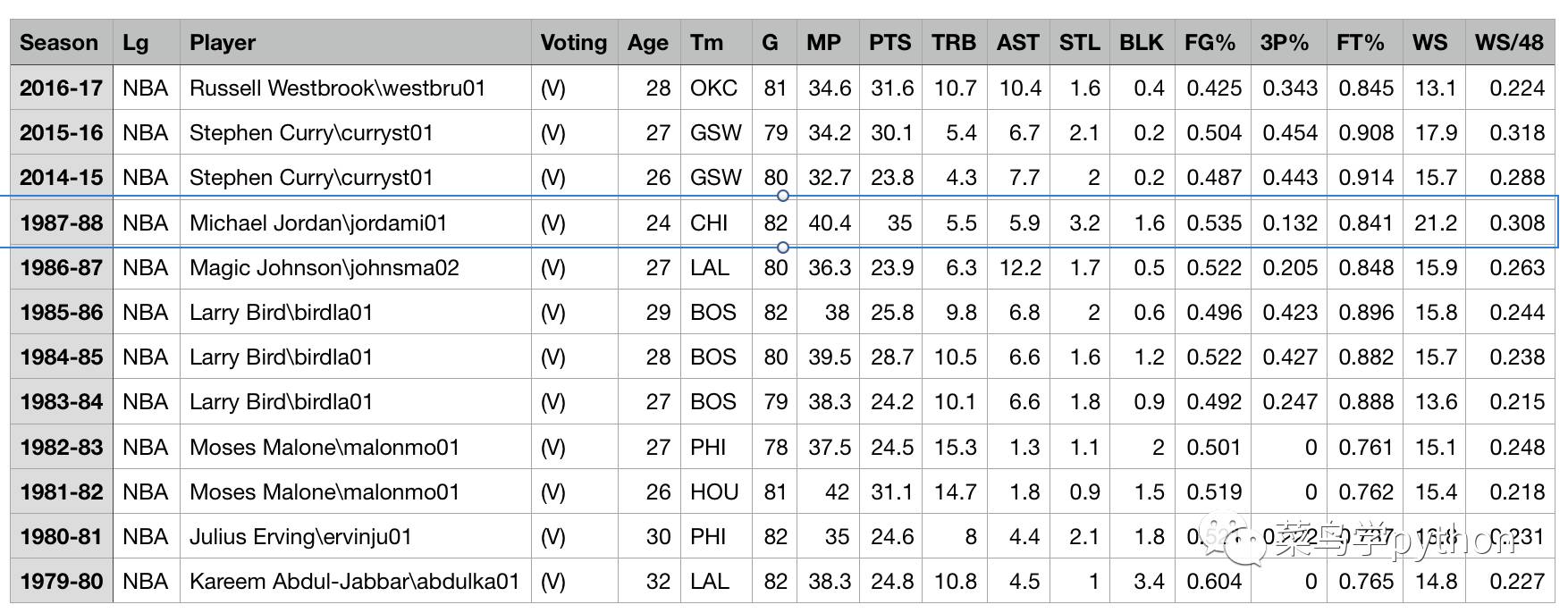 来源于https://www.basketball-reference.com/awards/mvp.html,其中可以选择多种形式,我选的是CSV格式,方便后面的数据分析,(文末会分享CSV文件和源码给大家)